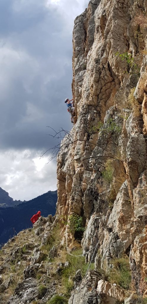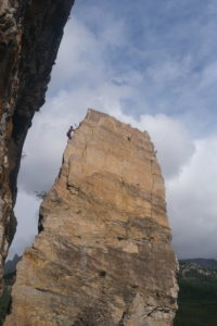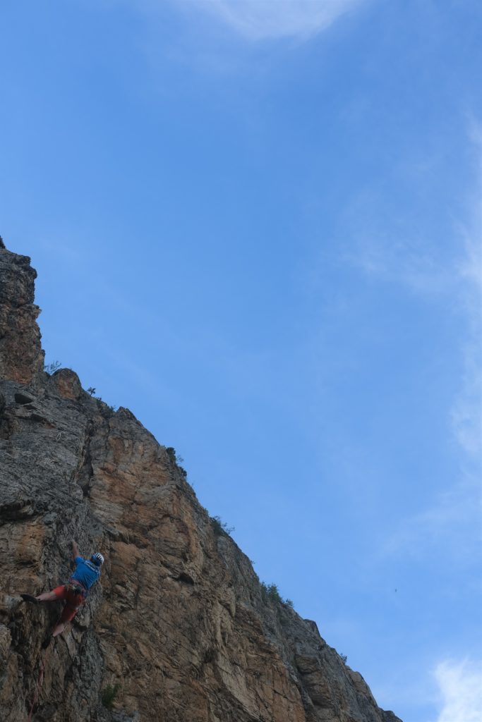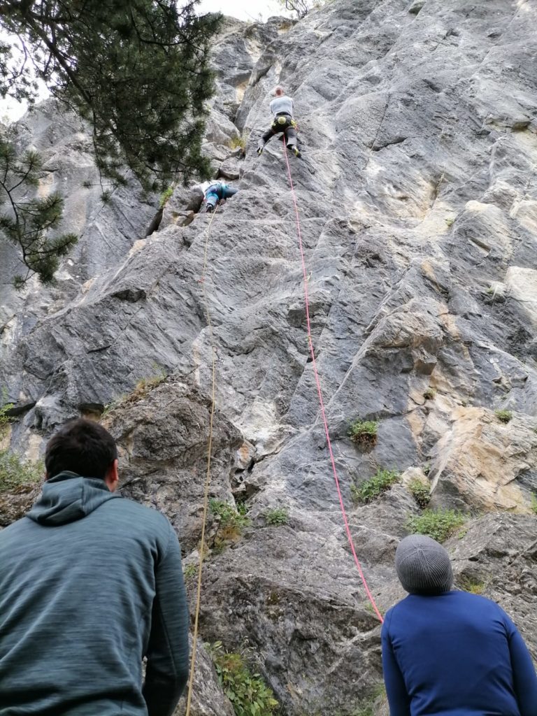 Après une pause déjeuner dans un champ proche, le groupe se scinde en deux entre mise en pratique ce qui a été vu le matin dans une « bébé » grande voie très accessible et un groupe grimpe plus classique. Paul, Aline, Audrey, Caro, Quentin, Nico, Brice et Stéphanie partent donc avec Momo expérimenter leur nouveau savoir en grandes voies. En parallèle, Lucie, JB, Mika, Thierry et Marie, accompagné de Babard sont contraint d’aller jusqu’au secteur ouest du site, une horde de minibus rempli notamment de grimpeurs suisses ou annéciens ayant pris possession du 1er secteur de Rocher Baron au fur et à mesure de la matinée. Nous serons finalement seul sur ce secteur essentiellement constitué de voies en 6, idéal pour sortir un peu de sa zone de confort en tentant beaucoup de à vue, en posant les dégaines.