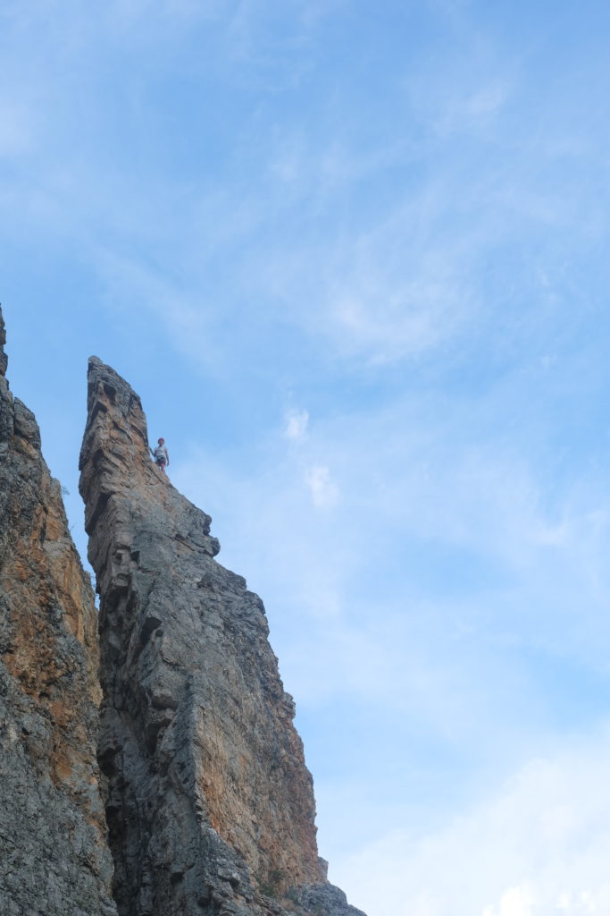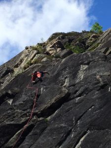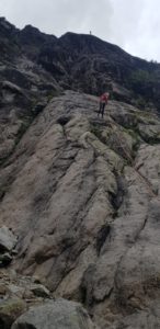 Groupe grande voie : la voie choisie, La Cocarde, se situe à Ailefroide, secteur de la Poire. Trois cordées seront constituées au départ : Mika & Thierry, Babard & Aline et enfin Paul & Marie. Pour résumer, on peut dire que l’ascension de cette grande voie a été épique et s’est transformé en véritable aventure, entre un sac qui s’échappe du 1er relais pour arriver au pied de la voie et contraint son propriétaire (dont on terra le nom) à redescendre le chercher, une erreur d’itinéraire, la pluie qui s’invite une partie de l’ascension (et grimper de la dalle mouillée c’est compliqué…), du temps à mettre en pratique les nœuds et manips tout juste apprises la veille, un système d’assurage qui glisse des mains pendant la descente en rappel… Epique… Tout le monde rentrera entier de cette grande voie avec tout de même une belle aventure à partager et raconter.