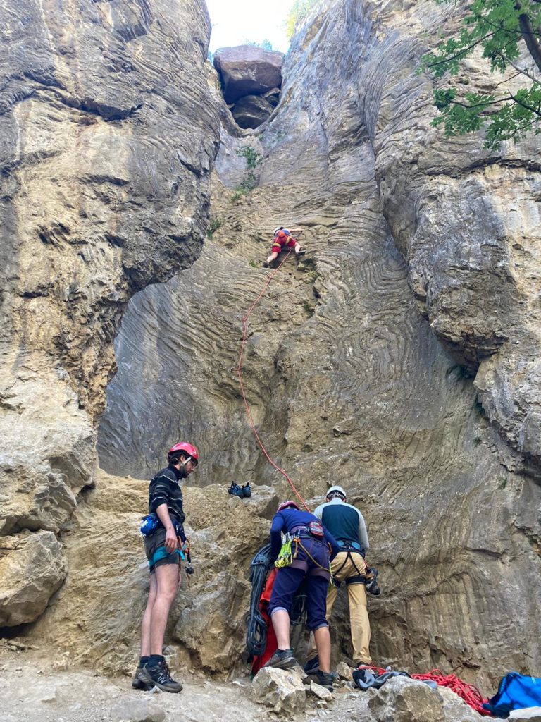 Direction le site de Rocher Baron où la matinée sera consacrée à l’apprentissage/révision des manips de corde pour les grandes voies. JB et Mika, déjà autonomes sur ce sujet, iront grimper de leur côté sur le site pendant que le reste du groupe écoutera attentivement les explications de Babard et Momo.