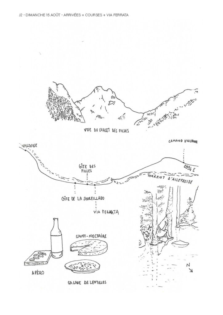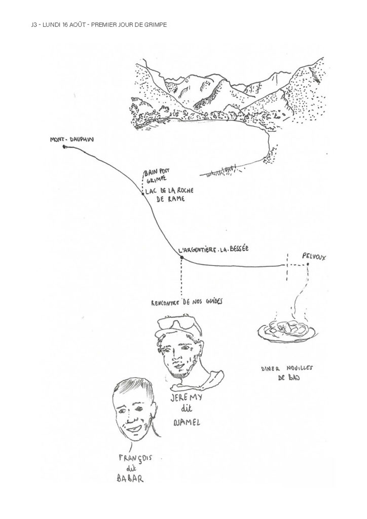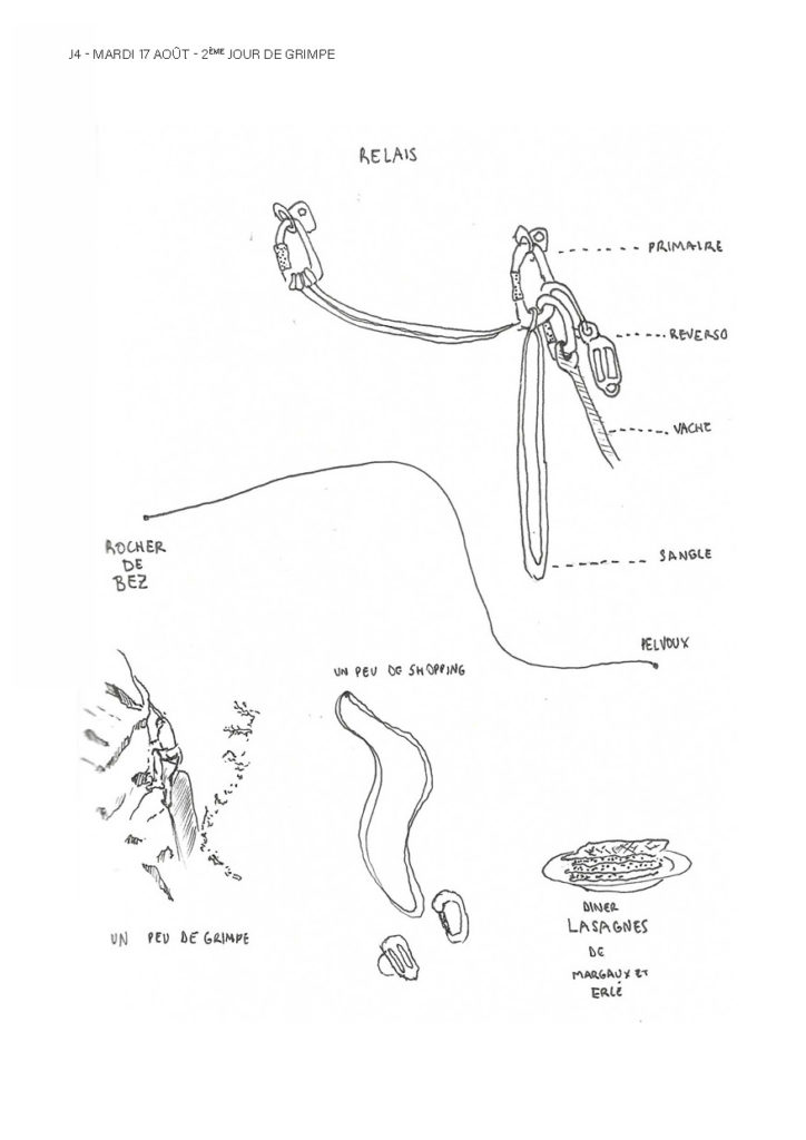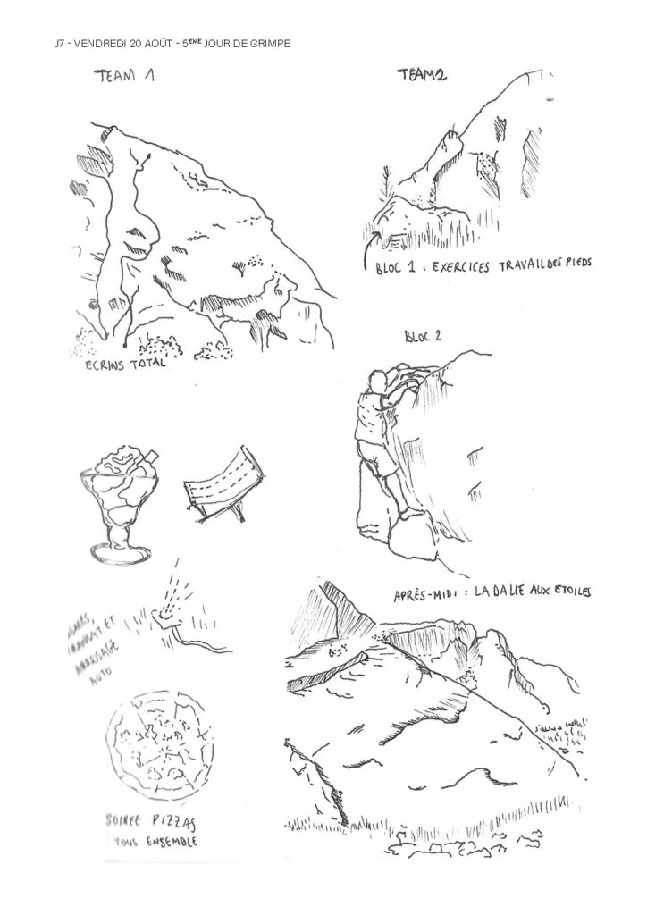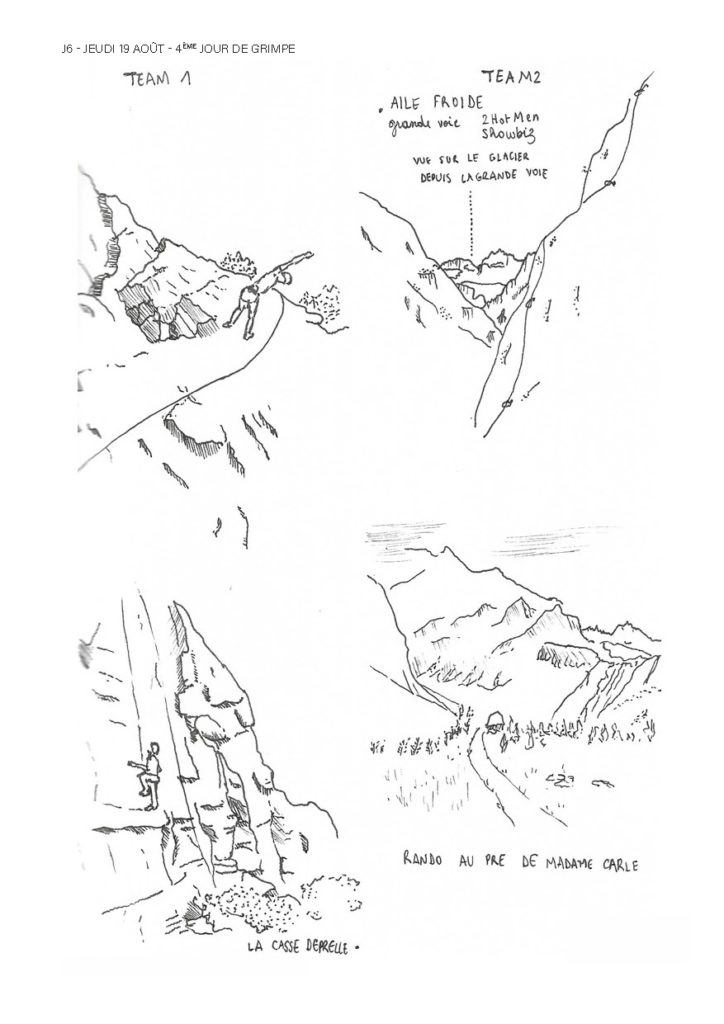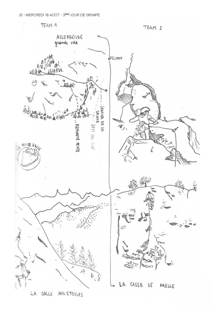 Une semaine de grimpe avec Gwen, Corentin, Thibaud, Margaux, Bao, Clémence, Baptiste, Isabelle, Adrienne, Erlé, Charlotte, Emma, Axelle, William et Elodie, résumée dans un récit graphique de Charlotte :