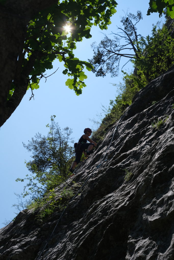 A 9h, nous retrouvons Babard et Momo, nos deux guides pour la semaine, direction le site de Mont-Dauphin, secteurs Thotal Kheops et 1er de corvée. Pendant que les moins aguerris apprennent la manip de haut de voies, l’autre partie du groupe se lance sur différentes voies. En fin de matinée, Mika et Caro nous rejoignent, le groupe est enfin au complet ! La journée file et les voies dans le 5 et le 6 s’enchaînent. Babard et Momo apprennent à nous connaitre et sondent nos envies pour la semaine, permettant ainsi d’envisager le déroulement des prochains jours. Sur le chemin du retour, nous faisons un arrêt au plan d’eau de La Roche-de-Rame pour un plouf et/ou un farnientage bien mérité.