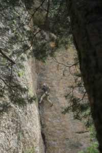 Groupe Couenne : au même moment, le reste du groupe (Momo, Caro, Audrey, Lucie, Quentin, JB, Brice, Nico et Stéphanie) se dirige vers les secteurs « initiation » et « Jonathan » du site des « Les Traverses et la Vignette ». Avec les conseils distillés par Momo, les progrès techniques et mentaux sont indéniables. Tous se lancent dans des voies de niveau supérieur à ce qu’ils pensaient réalisables, et même parfois sans connaitre la cotation. En témoigne la journée qui se termine quasiment pour tout le monde avec l’ascension du très esthétique 6a « Trango Tower ».