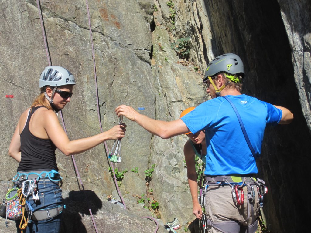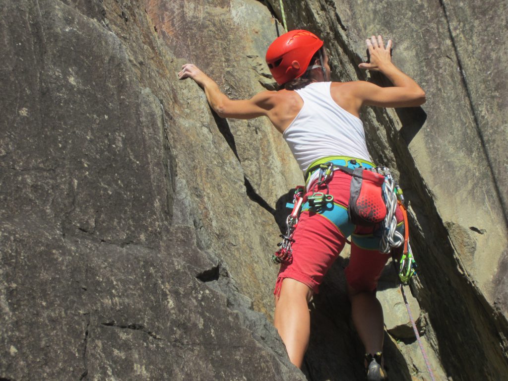 - Grimpe en posant des coinceurs et en posant des points de sécurité sur l’équipement de la falaise pour assurer la progression.