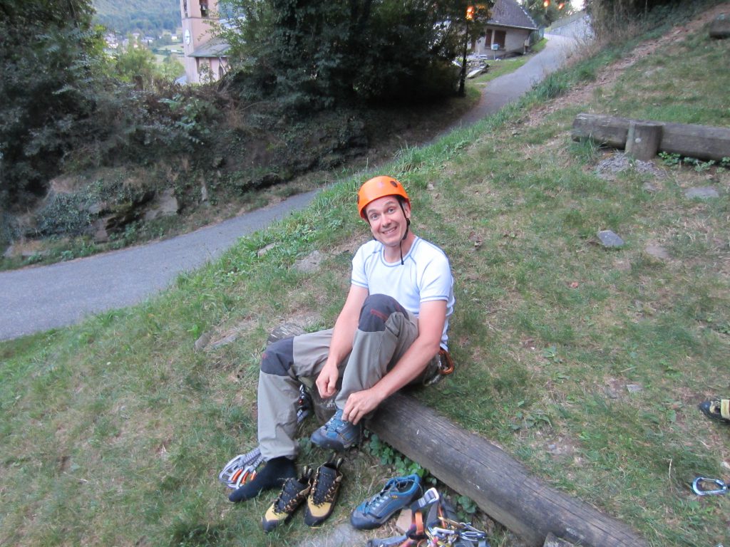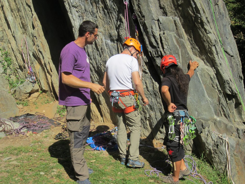 Après s’être familiarisé avec le matériel, l’apprentissage de la pause de coinceurs a commencé avec les précieux conseils de nos deux initiateurs (Jordane et Micka), tout d’abord, au sol et, ensuite, dans les voies en alternant pause de coinceurs et clippage des dégaines posées sur l’équipement de la falaise pour des raisons de sécurité, bien entendu.