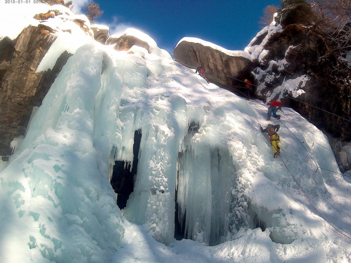 Parti pour faire la cascade en entier, le groupe #2 attaque au milieu d’autres cordées : mis à part quelques morceaux de glace sur la caboche, tutti va bene. Une belle récompense attend les « cascadeurs » à la dernière longueur lorsqu’il s’agit de rejoindre la ligne de rappel : une toute petite arête ensoleillée avec une vue magnifique. Séance photos obligatoire. La fine équipe retourne ensuite sur la cascade où les 8 se retrouvent finalement à la même longueur.