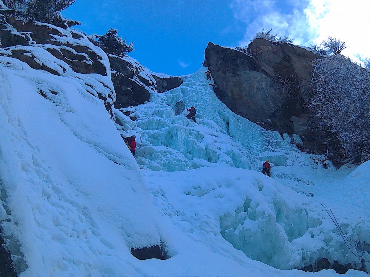 Le dimanche, les deux mêmes groupes sont maintenus : le groupe de François s’attaque à la longueur complète de la cascade de Lillaz tandis que celui de Guillaume se dirige vers la superbe cascade « pattinaggio artistico ». Malheureusement, l’accès à celle-ci est aussi encombré que Jules Ladoumègue un mardi soir. Le groupe décide alors de s’attaquer au « cigare » (colonne de glace) sur le troisième ressaut de la cascade de Lillaz. C’est l’occasion pour de découvrir une spécificité de l’escalade sur glace : on ne sent pas toujours le piolet/crampon lâcher prise, les vols en sont d’autant moins anticipés et donc effrayants…