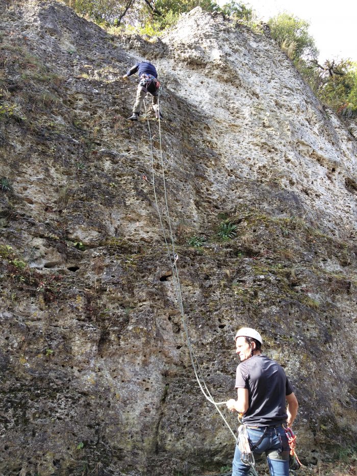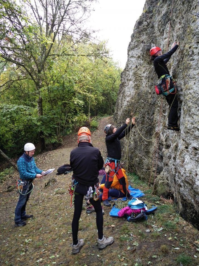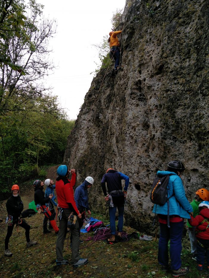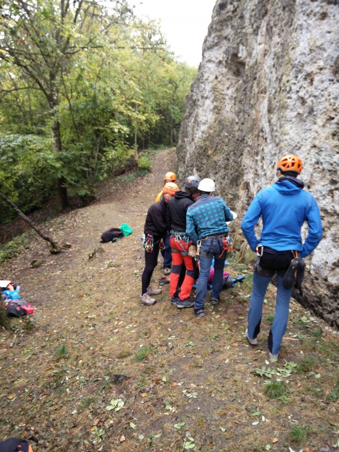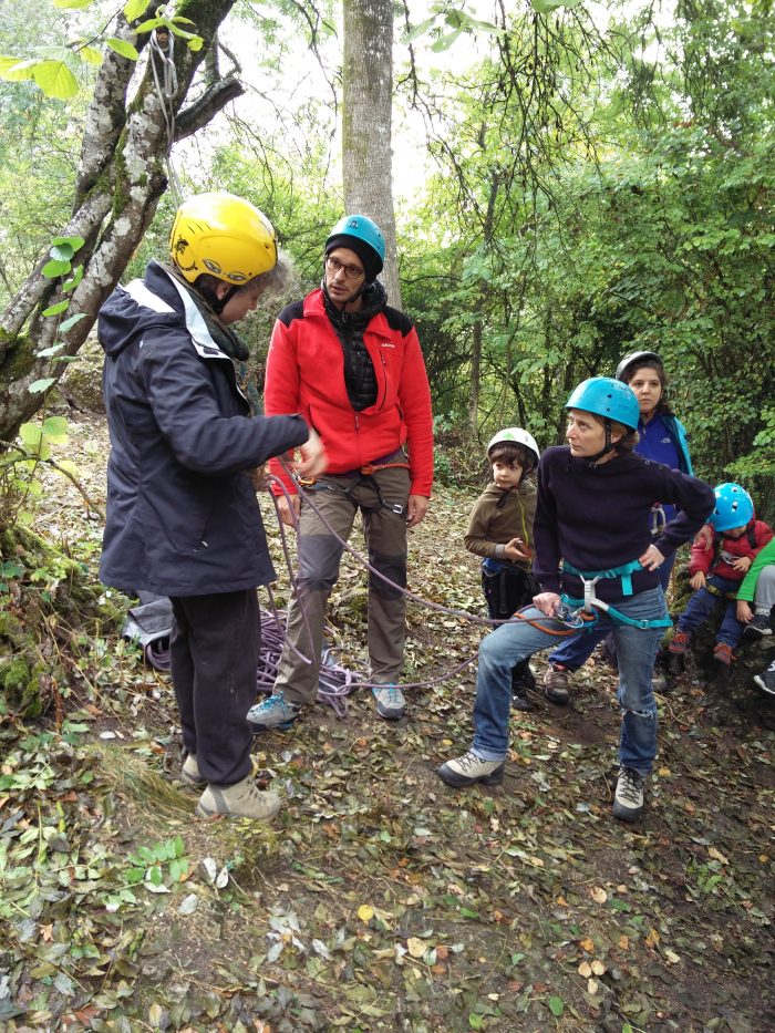 Quelques moulinettes sont posées pendant qu’un atelier « manip de haut de voie » occupe au sol l’essentiel des troupes dûment casquées. Apprentissage pour certains, très utile rappel pour d’autres, cette bonne heure pédagogique est également l’occasion de présenter les spécificités de la grimpe en falaise: la hauteur du premier point et l’impératif de parade ; le bon rangement du matériel sur le baudrier ; la pose optimum des dégaines ; le rythme particulier de la progression …