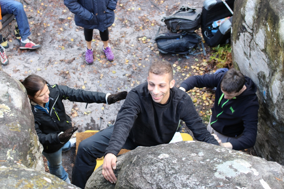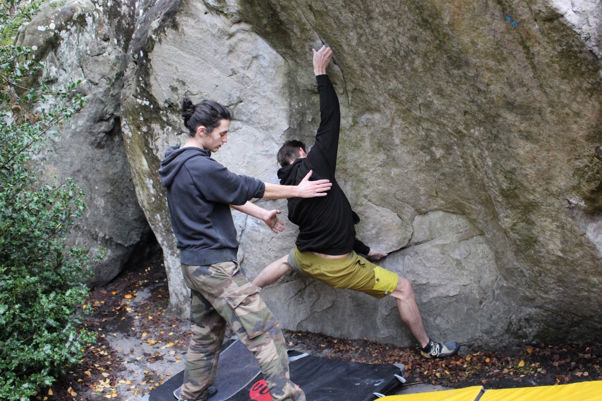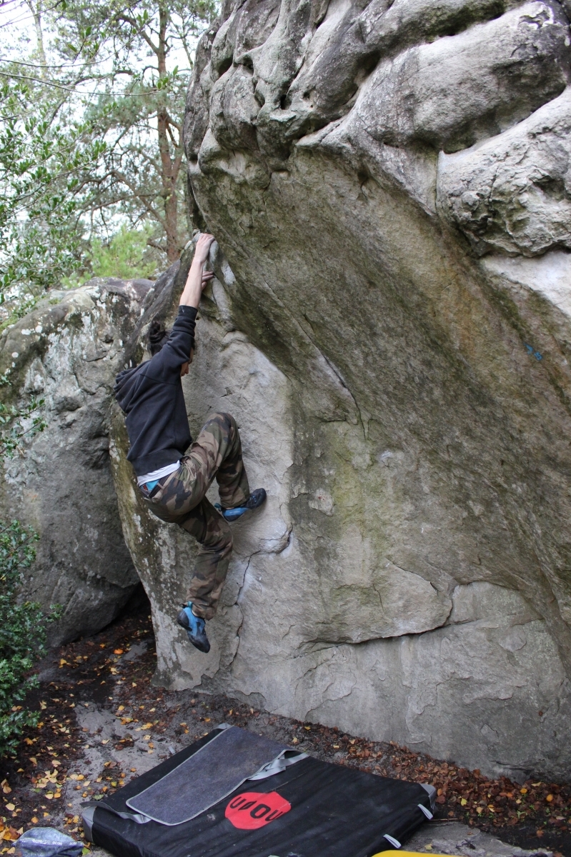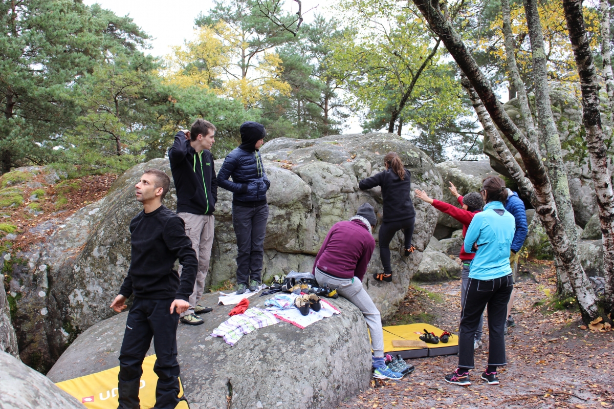 Le vendredi 11 novembre 2016, le club avait pris la direction du Rocher Canon à Fontainebleau, sous un ciel gris et menaçant mais la météo nous avait assuré qu’il s’agissait du seul jour « sec » de ce long weekend de pont. Nous étions 15 participants, plus 3 enfants sous la responsabilité de leurs parents. Nous nous sommes tous retrouvés vers 10 heures au pied des premiers blocs. Premiers mots sur la nécessité de parer les grimpeurs avec démonstration et exemple de chute réceptionnée sur crashpad (les deux du clubs ainsi que deux autres appartenant à des participants).